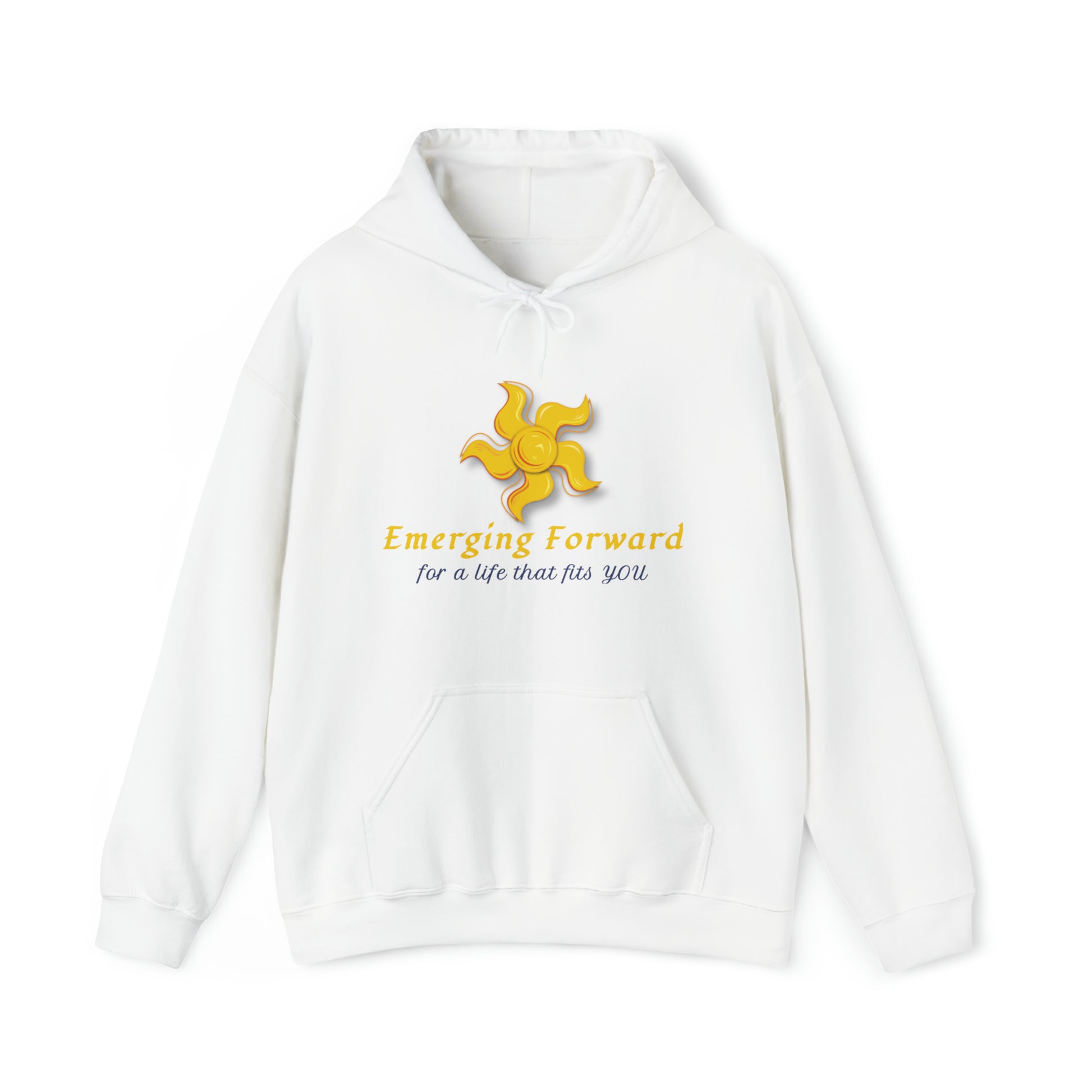This unisex heavy blend hooded sweatshirt is relaxation itself. Made with a thick blend of cotton and polyester, it feels plush, soft and warm, a perfect choice for any cold day. In the front, the spacious kangaroo pocket adds daily practicality while the hood's drawstring is the same color as the base sweater for extra style points.Proudly displays our logo to inspire you to always be emerging forward and to live a life that fits you.